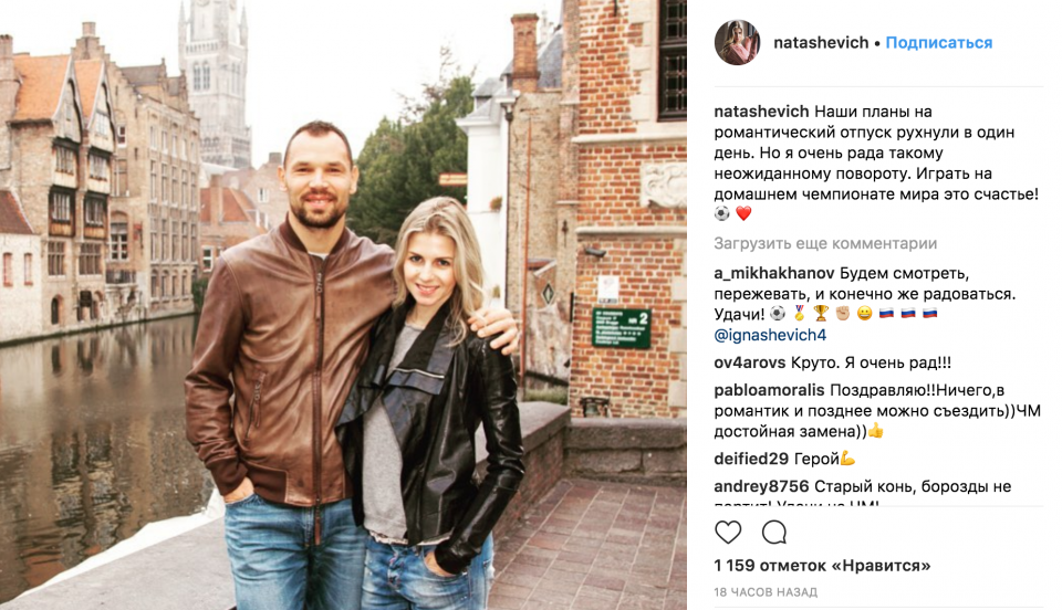 «Наши планы на романтический отпуск рухнули в один день. Но я очень рада такому неожиданному повороту. Играть на домашнем чемпионате мира – это счастье!», — написала в своем «Инстаграме» супруга Игнашевича Наталья.