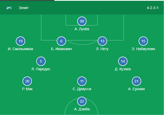 В прогнозе мы предсказывали тактику 4-4-2 для «Зенита», но Семак решил сыграть более оборонительной тактикой и выставил 4-2-3-1 с Дзюбой в роли чистого нападающего. Несмотря за заверения некоторых СМИ, что Ерохин и Кузяев слишком устали после матча с «Мольде» они вышли на игру. В целом этот же состав играл и против «Уфы» и добился победы 2:0.